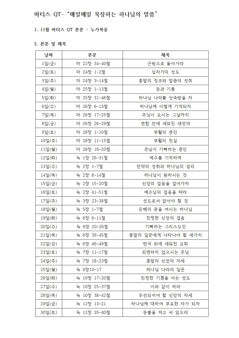 [바티스 QT - 11월 본문 안내] 마태복음, 누가복음 페이지 정보 작성자바티스성경아카데미 댓글0건 조회194회 작성일24.10.31 22:46 본문 공유 페이스북 공유 트위터 공유 이전글(11월 1일) 근원으로 돌아가라 - 마 22장 34~40절 24.11.01 다음글(공지사항) [바티스 QT- 11. 12월 동영상] 누가복음 24.10.31 댓글 0 댓글목록 등록된 댓글이 없습니다.